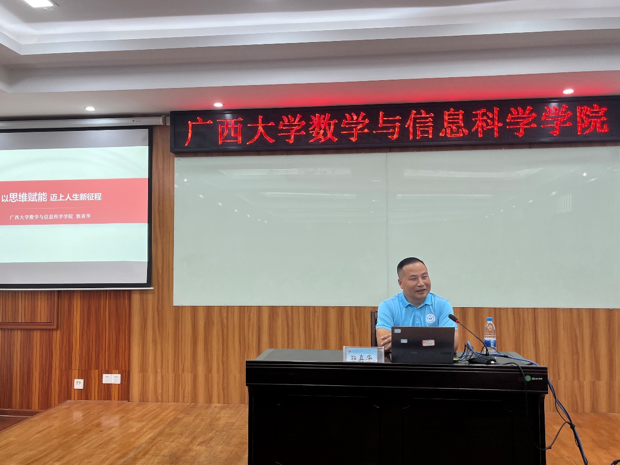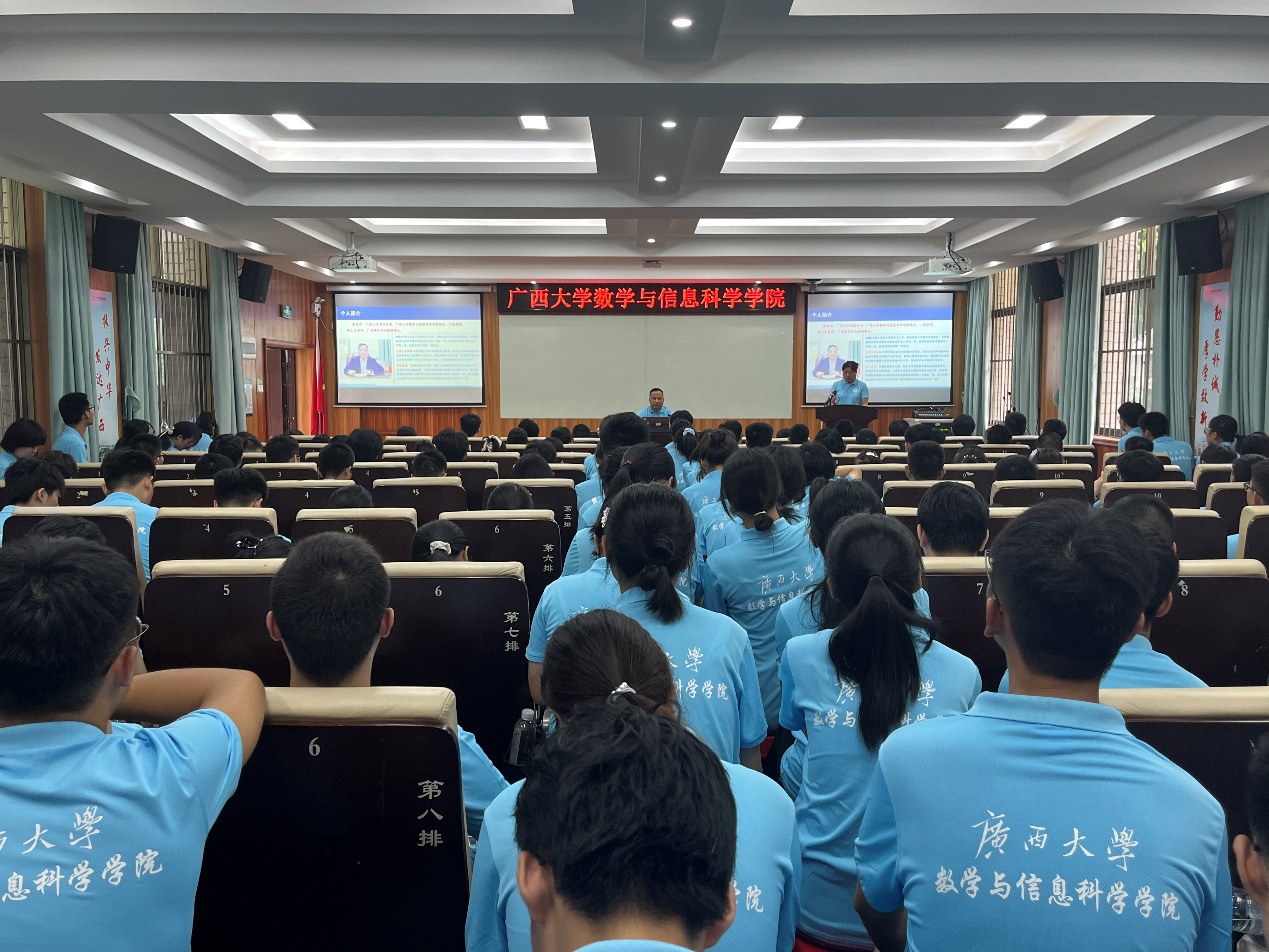 郭真华从大学是什么、我们的大学、我们的专业、我们的学习等四个维度展开讲授。他指出,“大学之“大”,在于学问之大,知识之大,在于求学之深与广,在于有大师也。他带领同学们回顾了新葡的京集团35222vip建校96年的校史脉络,从梧州立校到桂林兴校,从榕江避难到南宁复校,再到后来的两校合并以及入选国家“双一流”建设高校,用一幅幅图片、一组组数据为同学们再现了新葡的京集团35222vip的发展历程和取得的优异成绩,引导同学们深入认识和了解学校,树立爱校荣校的家国情怀和责任担当。接着,他又向同学们讲述了新葡的京集团35222vip的发展历程,并从何理解大学里的数学教育的角度为同学们剖析了大学数学和中学数学的不同之处和树立数学思维的重要性。最后,他鼓励同学们脚踏实地,多问善思,敢于追梦,努力成长为又博又专、愈博愈专的新时代人才。