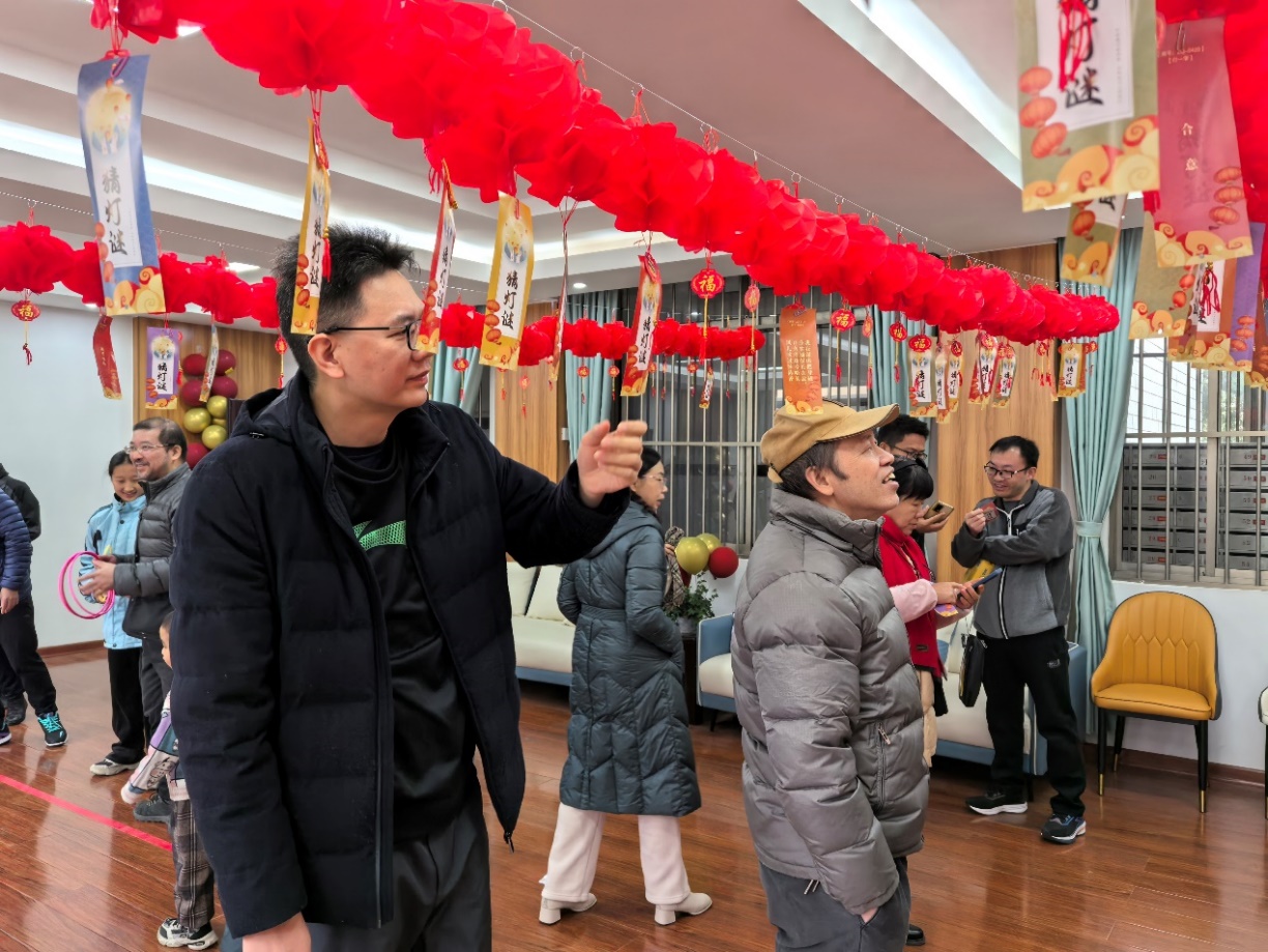 猜字谜活动现场,红灯笼下悬挂着一个个字谜,妙趣横生的谜面涵盖民俗文化、地理知识、历史人物、生活常识、歇后语等内容。老师们三五成群围在一起,共同探讨谜底、踊跃竞猜,共同领略汉字之美。