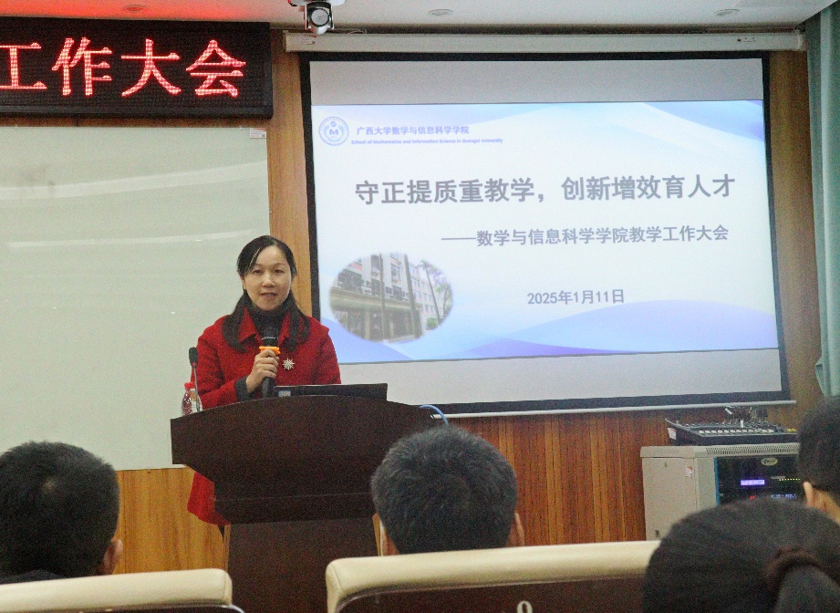 为进一步学习贯彻全国教育大会精神,推动信息技术赋能本科教育教学、加强学院基层教学组织建设、提升公共数学课程的教学质量、强化数学拔尖创新人才培养。1月11日,我院在报告厅召开教学工作大会。会议由学院党委书记吴华丽主持,全体教职工参加了会议。
